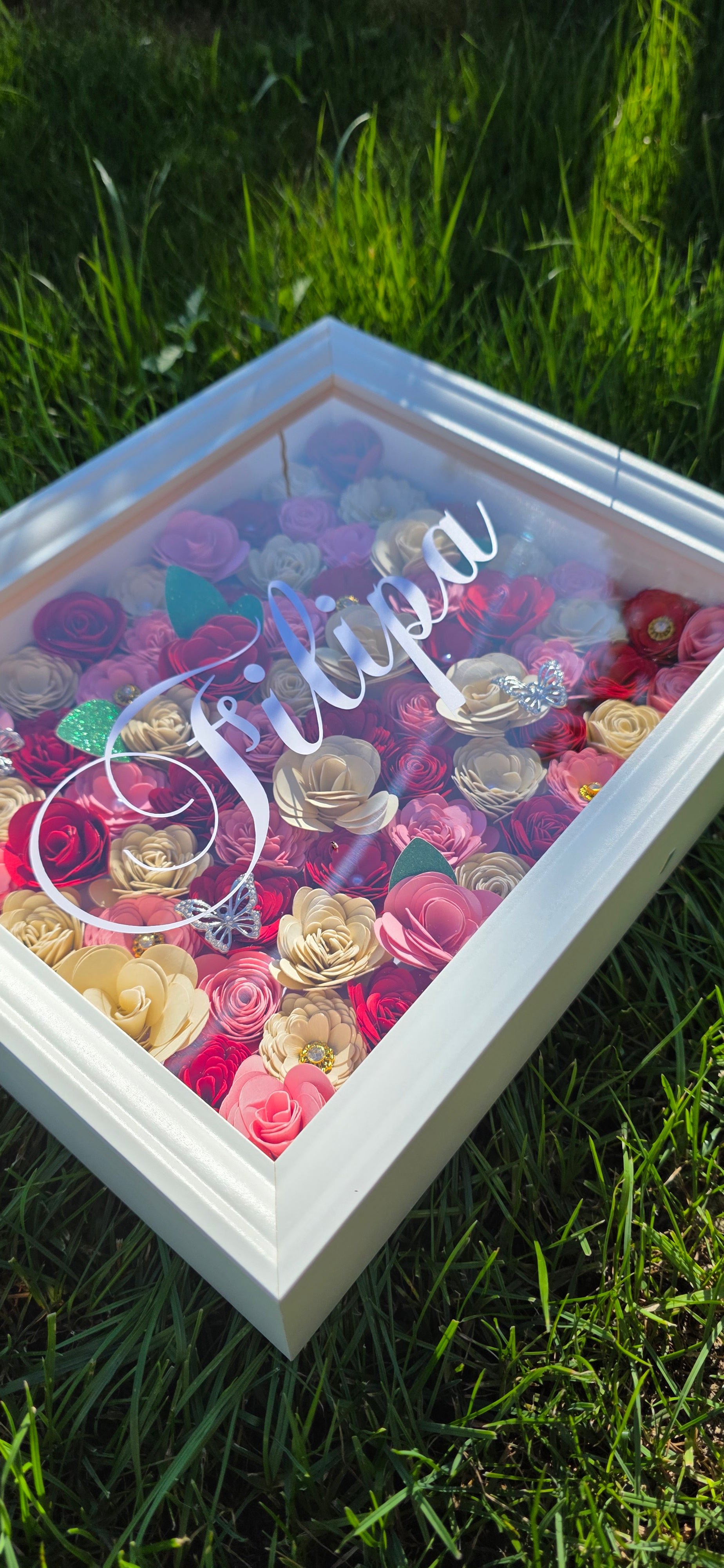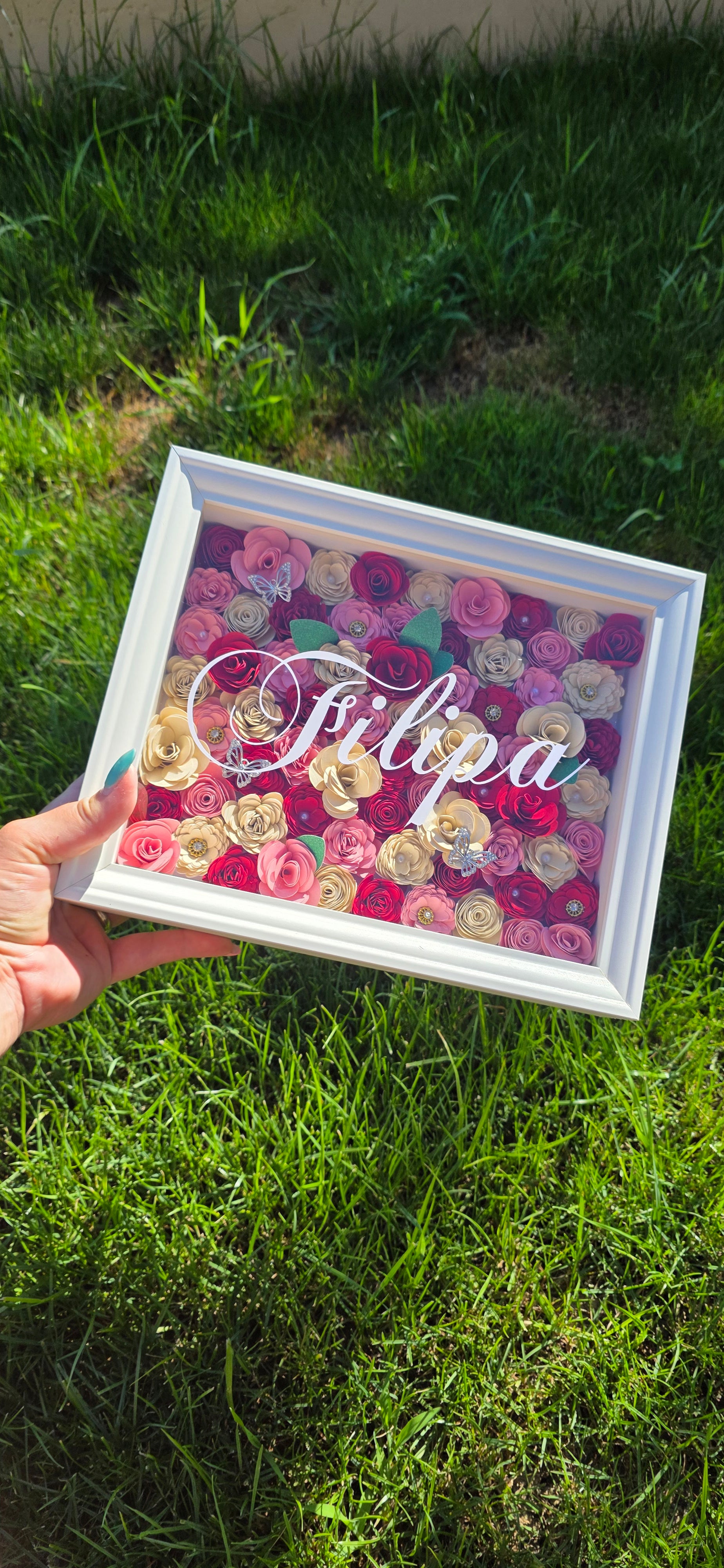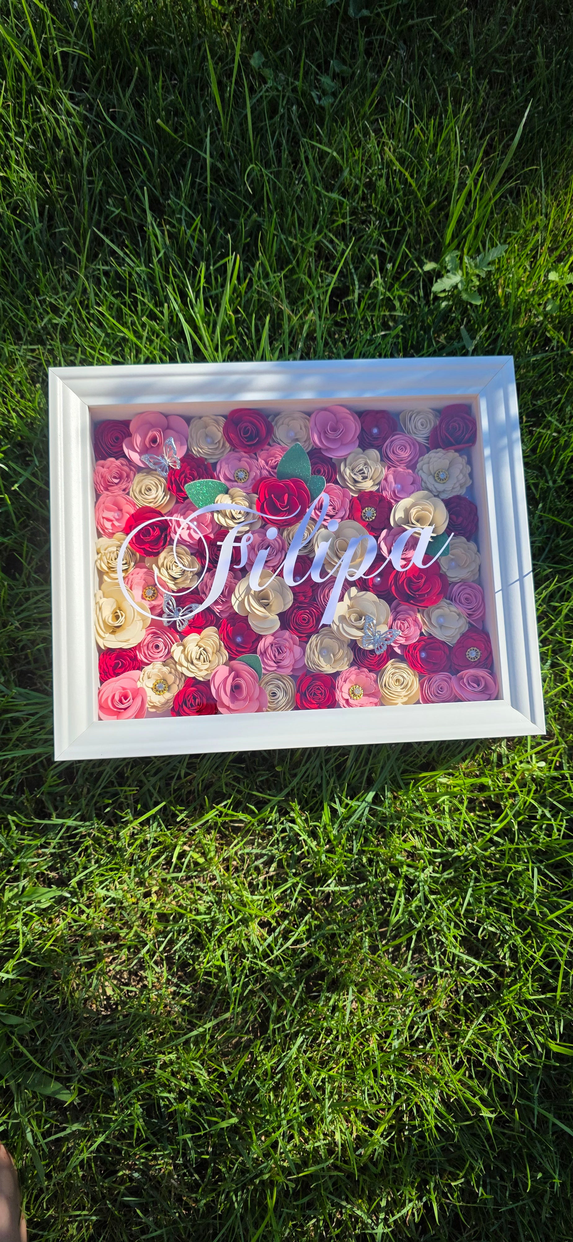 Ce cadre de 20x25 est rempli de petites fleurs en papier chacune enroulé individuellement a la main avec vous couleurs préférées et avec l'écriture de votre choix en vinyle sûr la vitre.