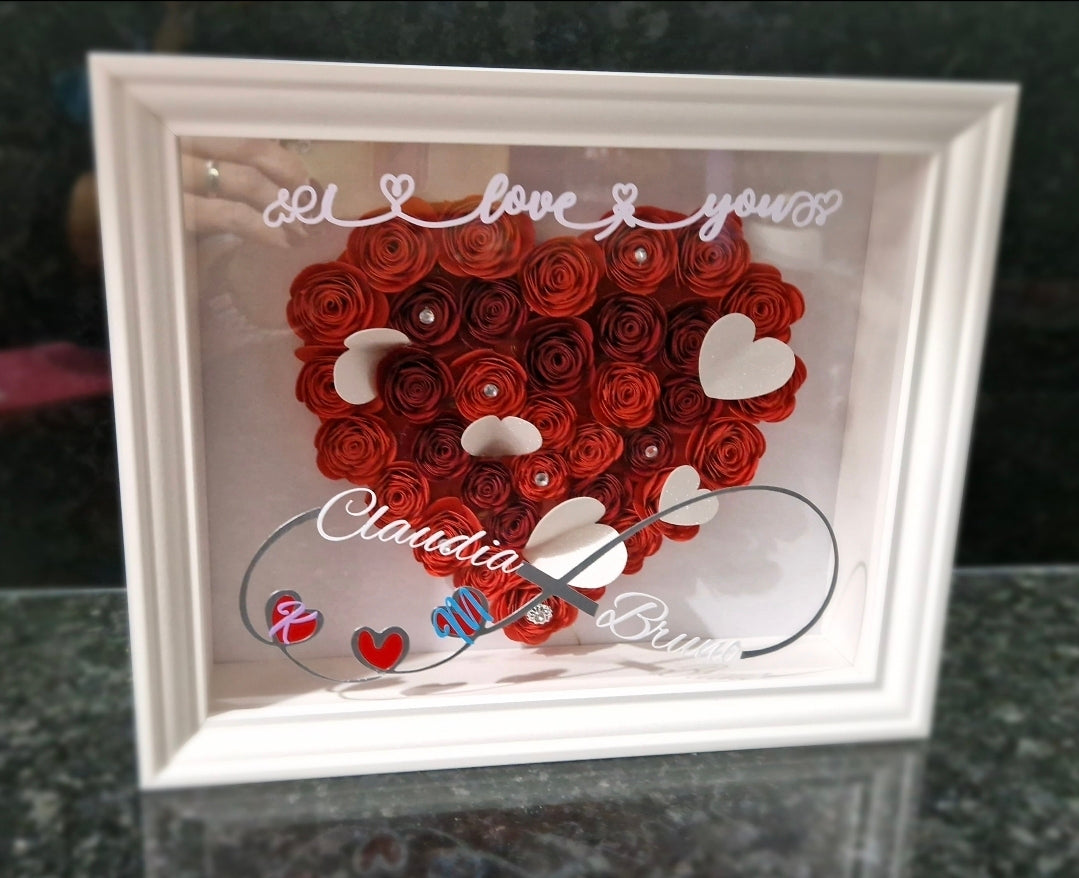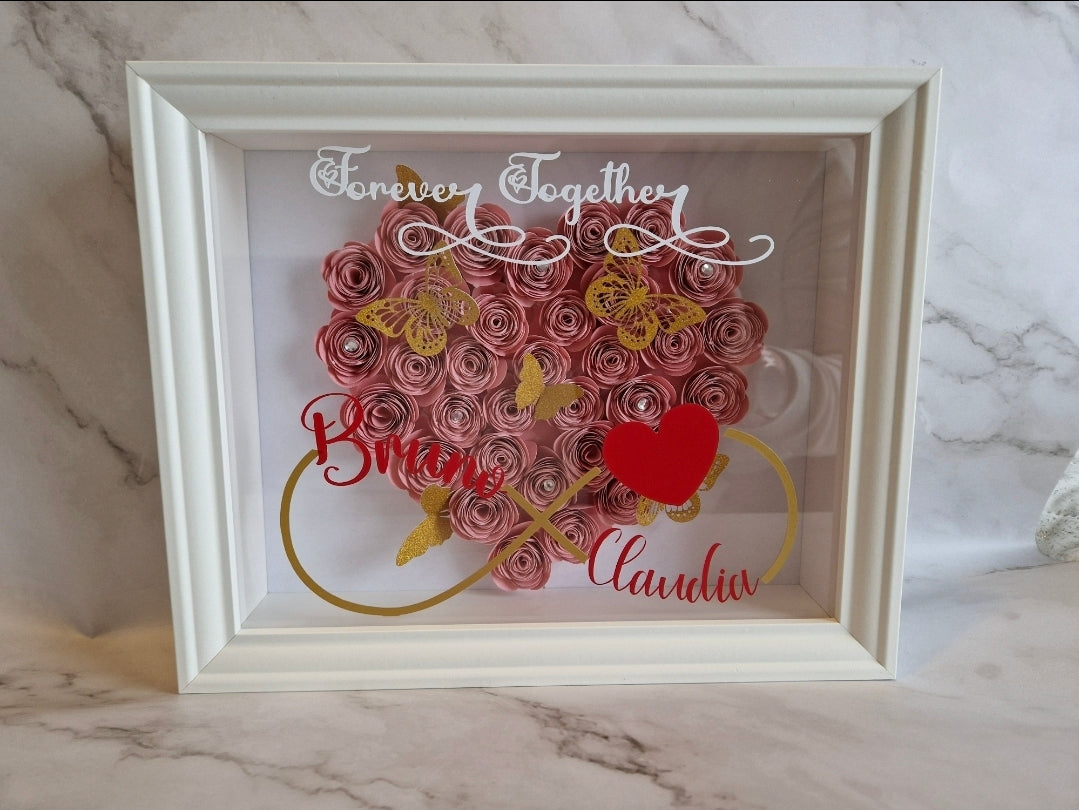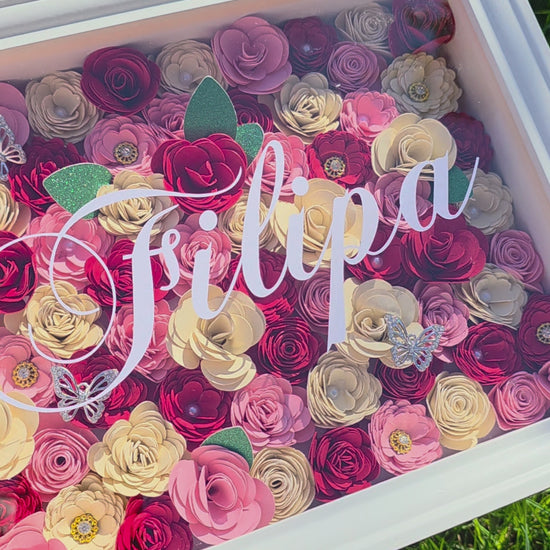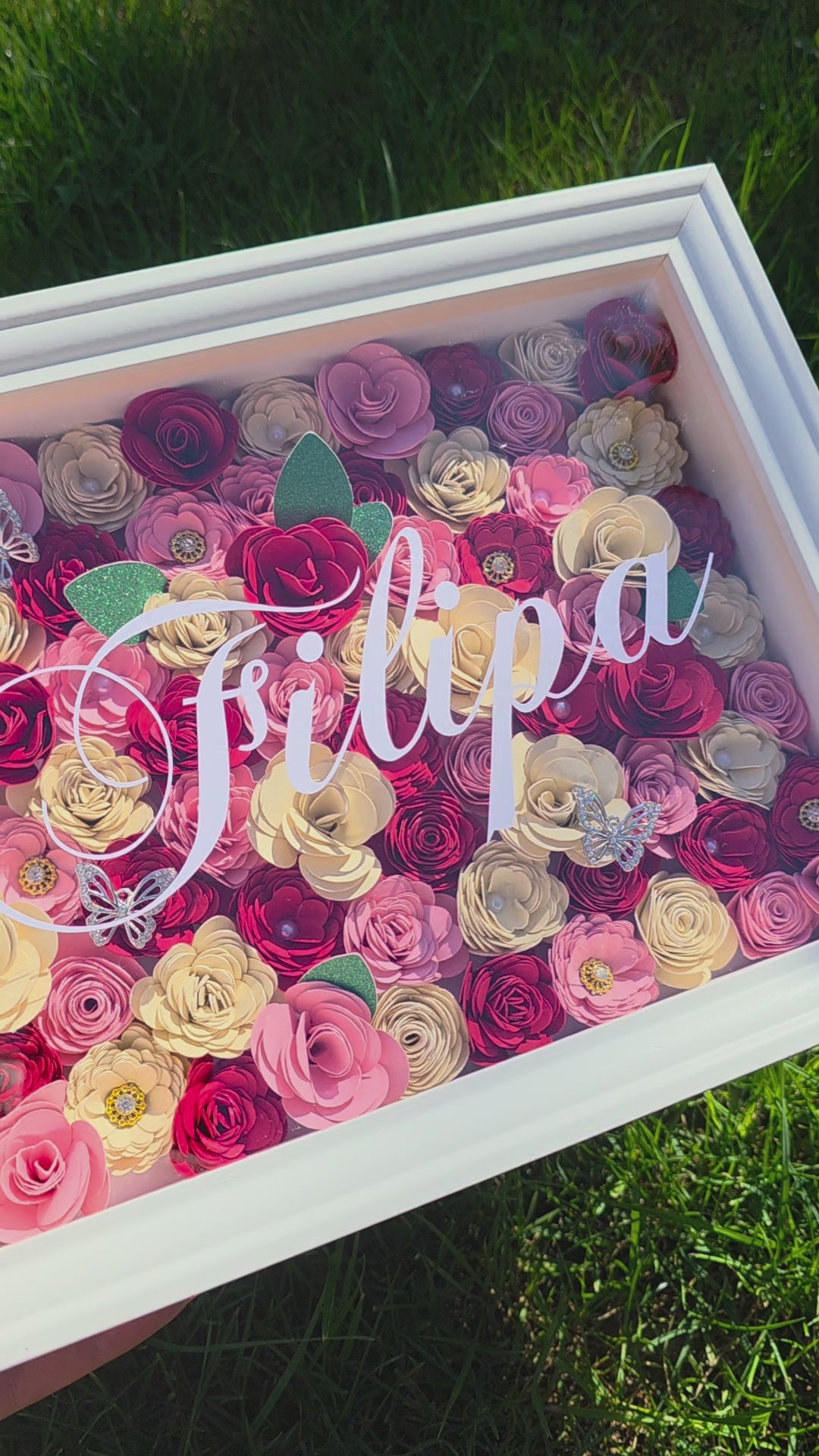 Ce cadre de 20x25 est rempli de petites fleurs en papier chacune enroulé individuellement a la main avec vous couleurs préférées et avec l'écriture de votre choix en vinyle sûr la vitre.